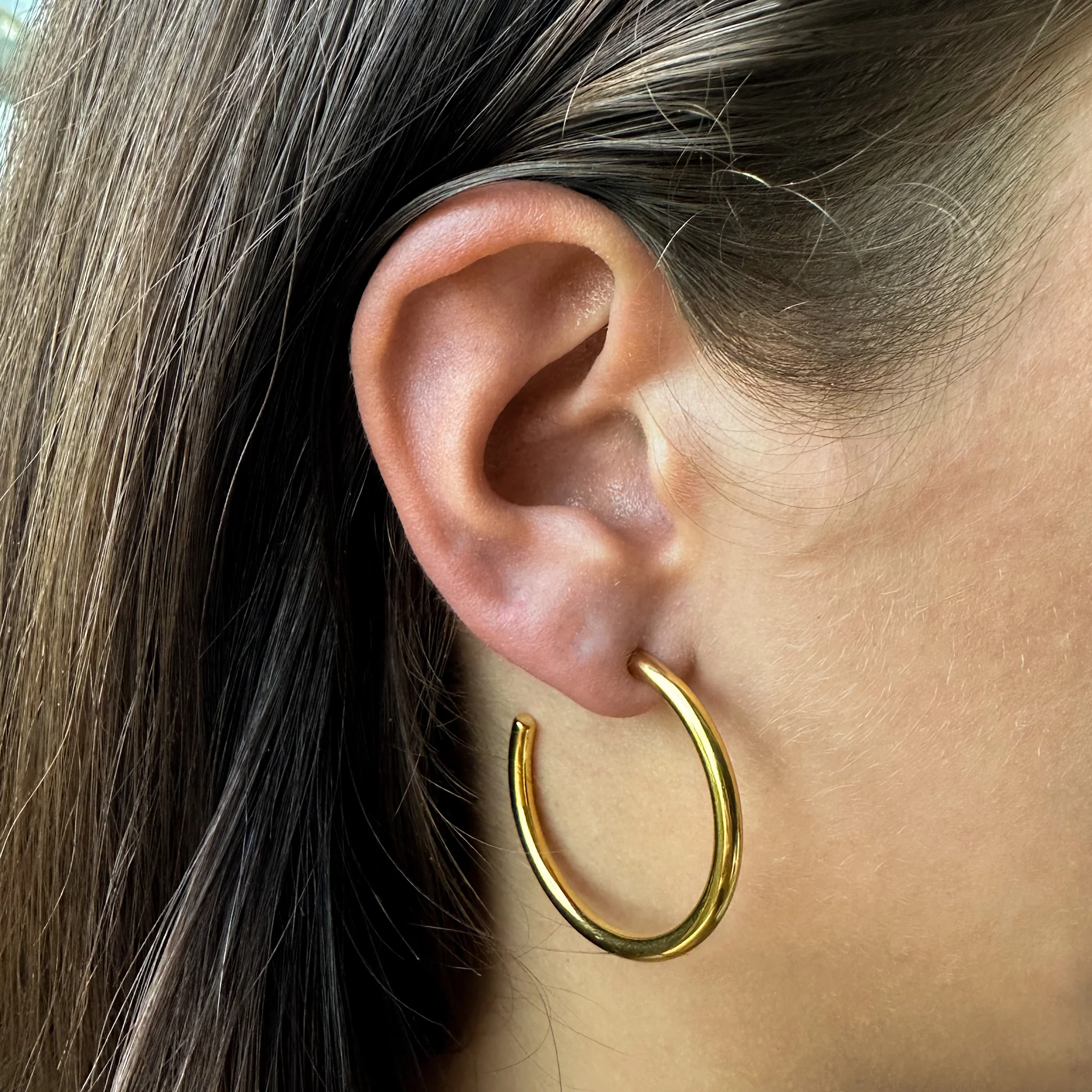 Introducing our Naomi Hoops - a touch of classic sophistication to your wardrobe. These sleek, large hoops offer a timeless elegance. Their slender and expansive design makes a refined statement, embodying the perfect marriage of simplicity and style.